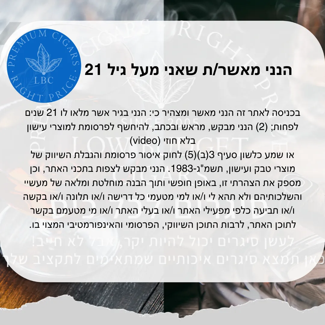 מכירה של מוצרי טבק למי שטרם מלאו לו 21 אסורה בהחלט. אזהרה: משרד הבריאות קובע: העישון מזיק לבריאות.